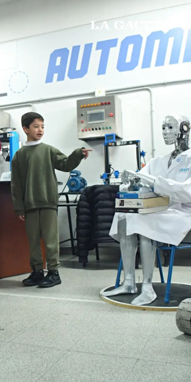Image from the LA GACETA newspaper of a child visiting the CIIDEPT Robotics exhibition, where Julius was on display.